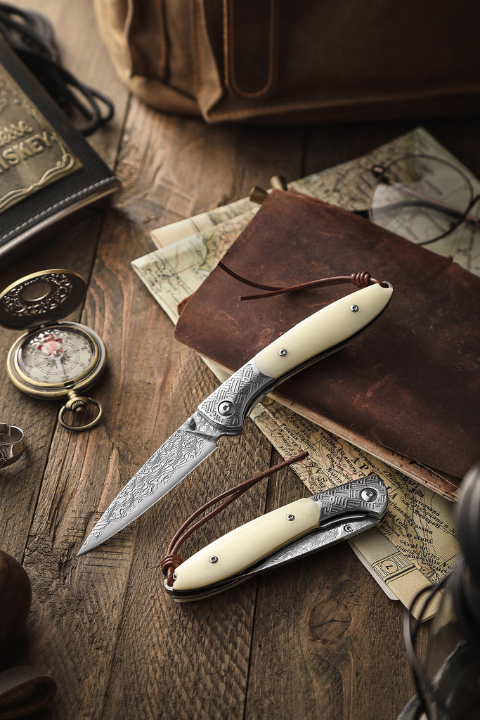 Piscis Austrinus-02W Handmade Pocket Knife,3.15in 67 Layers Damascus Steel Blade,Bone Handle